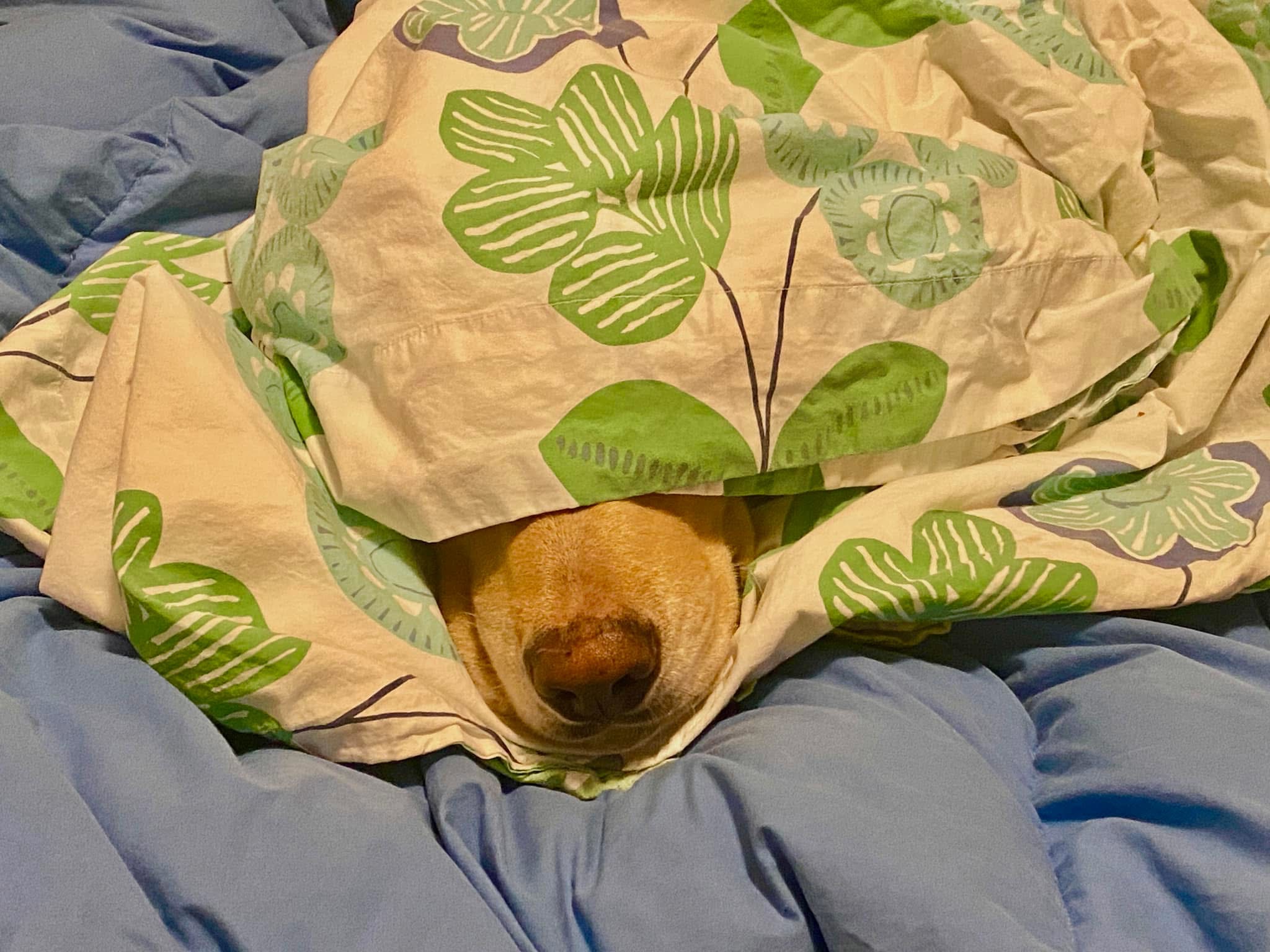 A Gentle Soul: The transformation in Auggie's demeanor is truly astounding. Where there was once panic and unrest, you'll now find a dog with a quiet, patient, relaxed gaze full of trust and peace. He chooses to rest quietly beside his foster person in the evenings and contentedly snuggles back into bed after breakfast—a picture of serenity.
