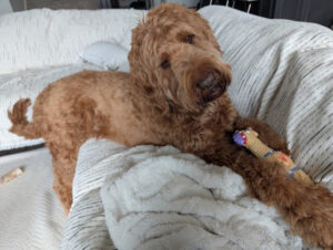 This adorable Goldendoodle is Duffy (#4427).Duffy is just over 3-years old. He weighs 101 pounds and is working on shedding about 10 of those pounds. Duffy is dealing with a persistent infection in his right ear.