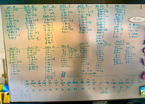 Keeping track of output is helpful for housetraining success. It’s hard to remember from day to day when you’re in the midst of puppy-raising (and maybe a little sleep-deprived). The following is an intense but effective method. You can do this on your phone or have AI create an app for you, but having a chart visually front and center helps keep you on track. Use your phone or regular timer and a dry erase board, window, or flowchart posted on the fridge.